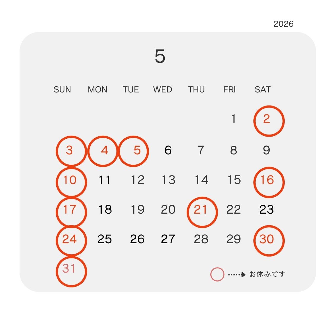 ニュース2026.04.20 5月の営業日のお知らせ 新緑が眩しい季節となりました。 皆さまいかがお過ごしでしょうか? 5月の営業日は以下の通りです。 2日(土)から5日(火)はゴールデンウイークの為、休業させていただきます。 21日(木)は研修の為、休業させていただきます。 よろしくお願いいたします。